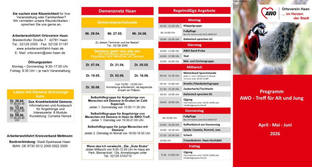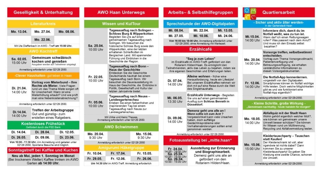 Der AWO Ortsverein Haan kann unter diesem Leitmotiv manche Hilfe und Unterstützung anbieten. Freizeitaktivitäten und Ausflüge kann man in Gruppen erleben und natürlich wird auch gemeinsam gefeiert.